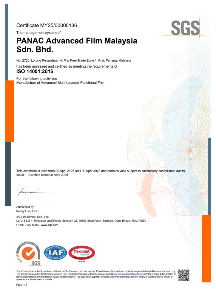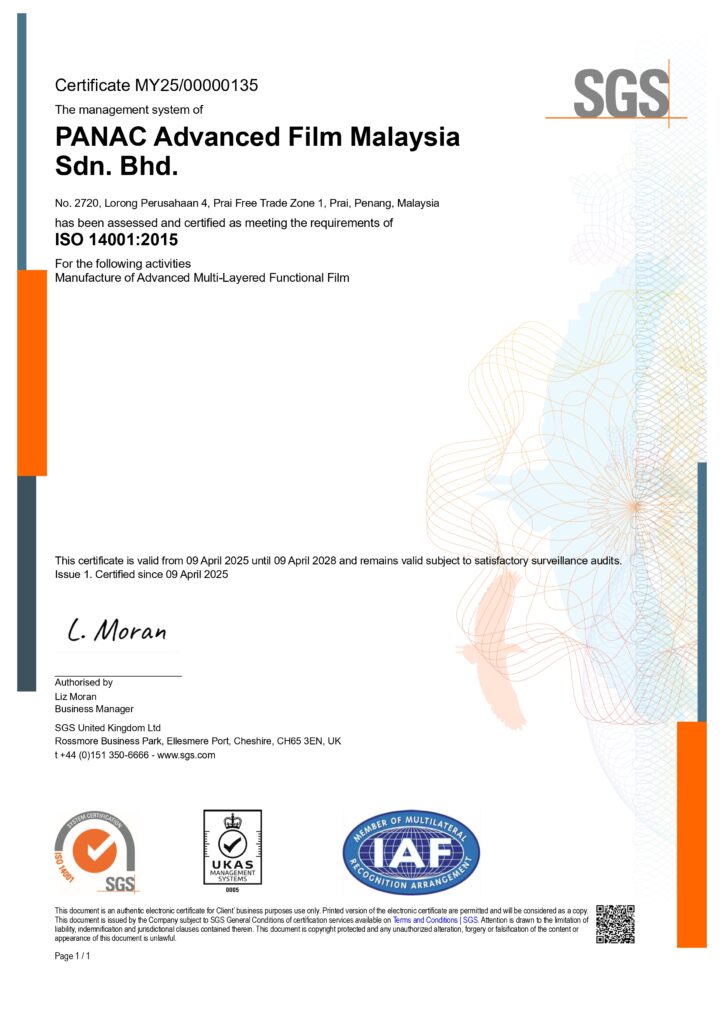 Panac Advanced Film Malaysia Sdn Bhd (PAM) has been awarded International Organization for Standardization (ISO) Certification for its Manufacturer of Advanced Multi-Layered Functional Film under ISO 9001:2015 & ISO 14001:2015